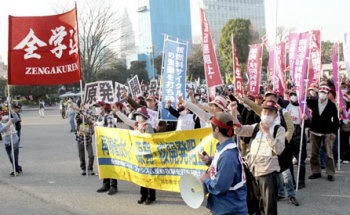 学生たちは「原発・核開発反対」の革命的スローガンを掲げて奮闘(3月9日、明治公園)――詳報次号 |