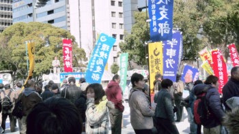 | 東日本大震災・東京電力福島原発事故から二周年を前にした三月三日、名古屋市では「愛労連」など日共系の諸団体を中心にして市民団体・個人が呼びかけた「さよなら原発inあいち 3・11明日につなげる大集会」が、市中心部の久屋市民広場で開催された。安倍政権が「安全が確認された原発の再稼働」をぶち上げたことに危機感にかられ、二〇〇〇名の労働者・学生・市民が参加した。 | |