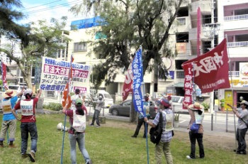 同時刻、たたかう学生たちは、那覇市県庁前の「県民ひろば」においても抗議集会と街頭情宣をくりひろげた。 (6月23日、県庁前) |