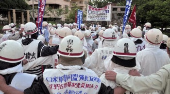 | 米軍石平司令部に抗議 7・5沖縄 七月五日、オスプレイ追加配備に突進する日米両政府にたいして怒りの声を突きつけるために「オスプレイ配備撤回・追加配備を許さないデモ行進」(主催・沖縄平和運動センター)が開催された。琉球大学・沖縄国際大学のたたかう学生たちは、結集した平和運動センター傘下の労組員や市民とともに、米軍石平司令部にたいするデモ行進に勇躍決起した。 |