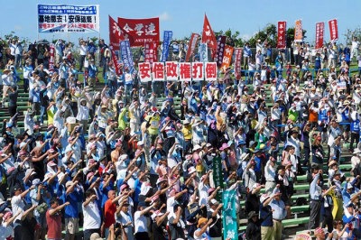 わが同盟の旗のもとにたたかう革命的・戦闘的労働者たちは、それぞれの職場から組合員を組織し、<辺野古新基地建設阻止! 先島への自衛隊配備反対!>の闘いの高揚を切りひらくために奮闘した。この労働者たちと固く連帯しつつ、県学連と全学連派遣団のたたかう学生たちは、闘いの最先頭において終始戦闘的にたたかいぬいたのだ。 米朝会談への幻想をあおる日共・志位指導部の闘争歪曲を弾劾しのりこえ、米朝権力者の相互瞞着の反労働者性を暴きだし「アメリカの対北朝鮮軍事攻撃阻止! 日本の参戦阻止! 北朝鮮の核武装反対! 米―中露の核戦力増強競争反対!」の反戦闘争を呼びかけたたかったのだ。この闘いのただなかで、「全基地撤去! 安保破棄!」「安倍ネオ・ファシスト政権打倒!」を掲げてたたかうべきことを鮮明に提起し闘いを牽引したのだ。 さらにたたかう学生たちは、十四日には辺野古現地において労働者・市民と連帯しつつ、辺野古新基地建設のための資材搬入を阻止するシュワブ・ゲート前座り込み闘争を展開したのである。 5・13県民大会 十一日からの平和行進をとりくんだ全県・全国の労働者は、最終日の十三日朝、大型バスで続々と平和行進出発式会場(宜野湾市民会館前)に結集した。自治労、全港湾、全水道、高教組、沖教組、国公労、私鉄総連など労組ののぼりが林立した。琉大・沖国大ののぼりとともに、全国各大学ののぼりや旗もひるがえる。各地のたたかう学生たちもこの場に決起しているのだ。 決起集会の後、三一〇〇名の労働者・学生が普天間基地を囲むように二手に分かれて行進した。灼熱の太陽が照りつけるなかを参加者は「普天間基地撤去!」の怒りの声をあげながら県民大会会場に集結してくる。 わが同盟の情宣隊は、参加者に「安倍政権を打倒しよう!」「全基地撤去・安保破棄めざしてたたかおう!」と力強く呼びかけつつ、わが同盟のビラを配布した。労働者は「がんばりましょう」と呼応する。ビラをうけとり「もう二枚ください」と声をかけてくる労働者もいる。会場のあちらこちらで、参加者がくいいるように熱心にビラを読んでいる。 県学連・全学連 全国から結集した人民に「核安保粉砕」の檄 いよいよ県民大会の開始だ。 最初に実行委員長の山城・沖縄平和運動センター議長が発言にたった。彼は「辺野古の海に六月にも土砂が入るかもしれない緊迫した情勢だ。宮古には自衛隊の軍事基地が建設されようとしている。二度と戦争の道を許してはならない」と力強く呼びかけた。 平和フォーラムの藤本共同代表は、「普天間第二小学校では、米軍機が飛来するたびにいまも子供たちが一日に何回も避難している。異常な事態だ。弾圧に屈せず声をあげつづけよう」と訴えた。 つづいて照屋衆議院議員が発言にたった。彼は「安倍は自衛隊を明記する改憲をすすめている。戦争国家への暴走を許すな!」と危機感に満ちて訴えた。すかさずたたかう学生が「安保を破棄しよう!」と革命的ヤジを飛ばして参加者を鼓舞した。 伊波参議院議員は「朝鮮半島で戦争がおこれば沖縄だけでなく日本中が戦場になる。九条を変えて戦争のできる国にする安倍に政治をまかせられない」と訴えた。 ヘリ基地反対協の安次富共同代表は「辺野古の護岸工事はまったくの違法工事だ。運動を再構築してがんばろう」と呼びかけた。 発言の最後に、韓国済州島で海軍基地に反対してたたかっている団体の代表が発言にたった。彼は「民衆に痛みだけ押しつける米軍は米国に追いかえそう! 辺野古新基地反対!」と力強く訴えた。この発言には、会場からひときわ大きな拍手とともに「共にがんばろう!」と連帯のかけ声が飛んだ。米軍基地に反対してたたかうものの国境を越えた連帯の絆をうち固めたのだ。 会場には、四月二十三日から二十八日の六日間、シュワブ・ゲート前での連続座り込み闘争をたたかった労・学・市民も多数結集している。辺野古崎の本格的埋め立て工事開始にたいして果敢な阻止闘争を貫徹し、さらなる激闘にむけてたたかう決意を燃やしている彼らを先頭にして集会の熱気がいやがうえにも高まるなかで、最後に全参加者は、「辺野古新基地建設阻止! 自衛隊増配備・改憲阻止!」などをうたう大会宣言を採択した。真っ青に晴れあがった沖縄の空に団結ガンバロウの声を力強く轟かせたのだ。 会場には琉大・沖国大の自治会旗と全学連旗がひるがえり、革マル派ののぼりがたなびく。たたかう学生が会場後方ド真ん中に「安」「倍」「政」「権」「打」「倒」と赤で書いた一枚プラカードを掲げる。「辺野古新基地建設を許すな! 憲法改悪阻止! 基地撤去! 安保破棄! 安倍ネオ・ファシスト政権打倒!」と大書した琉大・沖国大自治会の大横断幕がピーンと張られ、全参加者を鼓舞した。 こうしてわが革命的左翼は、5・13県民大会に結集した人民に「核安保同盟の強化反対」を訴えたのだ。 「アメリカの対北軍事攻撃反対! 北朝鮮の核武装反対!」の旗高く奮闘 「復帰4