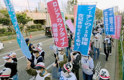 福岡市中心部の天神・警固公園に結集した革命的・戦闘的な労働者・学生は、デモに先立って決起集会を実現した。「春一番」の風をうけ、革マル旗や全学連旗がひるがえる。司会のコールに合わせてまずシュプレヒコールだ。「ロシアのウクライナ侵略粉砕!」「ウクライナ人民と連帯してたたかおう!」公園内の市民がいっせいに注目した。 最初に九共闘の代表が基調提起にたった。彼は開口一番「侵略開始から四年、いまプーチン政権は東部ドンバスで占領地を拡大するための作戦を強行している。無人機、ミサイルによる都市部への無差別攻撃とインフラ破壊に狂奔している。これを断じて許すな」と訴えた。「今この時も、ウクライナの労働者人民は極寒のなかを助け合いながらロシア侵略軍と戦いつづけている。ウクライナ人民を孤立させるな」と力を込めた。この発言者の心からの叫びを、参加者は拍手でガッチリと受けとめた。 つづいて反戦青年委員会の仲間の決意表明だ。彼は冒頭、ロシア軍がウクライナの炭鉱労働者のバスを爆撃し十五名を虐殺したことを弾劾した。「彼らは氷点下で凍える人民に暖房を供給するための燃料を命がけで届けていた」「彼らはわれわれと同じ労働者だ。私は我が身が切られるような思いだ。プーチンの人非人的な虐殺を怒りを込めて弾劾する」と。そして「ウクライナ労働組合連盟青年評議会」のアピールを紹介し、これを「心の底から受けとめ、日本の地でウクライナ反戦闘争を進めよう」と呼びかけた。 最後に発言にたったのはわが同盟の同志だ。彼はまず、四年におよぶウクライナの労働者人民の抵抗の偉大さについて話した。「プーチンが人民の抵抗の意志を挫くために労働者や子どもを虐殺しインフラを破壊しつづけている。しかし極寒のなかウクライナ人民は助け合い不屈に抵抗しつづけている。多くの犠牲者を出しながらたたかいつづけるのはなぜか。郷土を守るために戦った家族や仲間の死を無駄にしないためだ。そして、スターリン主義ソ連の時代に決して戻りたくないからだ。さらに先進的な労働者たちは戦火がヨーロッパや全世界に広がるのを阻止するために戦っている」と。 そして、同志は腹の底から声をふりしぼって訴えた。「レジスタンスをたたかうウクライナ人民と連帯して<プーチンの戦争>をうち砕く闘いは、世界史の今後を決する闘いだ。二十一世紀の深まる暗黒化を突破し、戦争も貧困も抑圧もない時代を切りひらく闘いなのだ。<帝国主義打倒・スターリン主義打倒>を掲げるわが革マル派は、アメリカ帝国主義の横暴とも、ロシアや中国の反人民的悪逆ともたたかってきた。われわれとともに、新たな時代を切りひらくためにたちあがれ!」