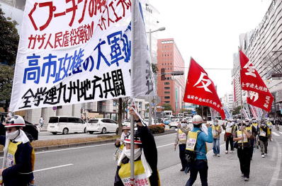 天神を圧倒する戦闘的デモ 「いざ、デモにうってでるぞ!」気合いに満ちたデモ指揮者の声で、白ヘル部隊は出発だ。「<プーチンの戦争>粉砕! 高市政権の大軍拡阻止!」と大書した横断幕を先頭に、反戦旗などの赤旗、そして色とりどりのノボリを林立させてデモ隊は天神の街並みを練り歩いた。 渡辺通りを三越前から北上し、西鉄福岡駅前、パルコ前を抜けた。たくさんの市民が歩道を埋めるように歩く横を、わが仲間たちは元気に行進した。「<プーチンの戦争>を許さないぞ」「アメリカのイラン攻撃を許さないぞ」「日米安保粉砕」「スパイ防止法の制定反対」「闘争放棄を決めこむ日共中央弾劾」――わが部隊のシュプレヒコールが天神一帯に轟き渡った。 |