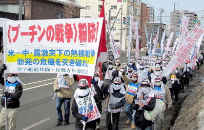 「<プーチンの戦争>粉砕! エネルギー施設への攻撃反対! 米露によるウクライナ分割反対!」「イスラエルのパレスチナ人民虐殺弾劾!」「アメリカのイラン軍事攻撃を許すな!」デモ隊がシュプレヒコールをあげて力強く市街地を突き進む。 デモ隊の左手に在札幌ロシア総領事館が見えてきた。労学は総領事館にむけて怒りの拳を突きあげる。「スターリンの末裔の犯罪を許さないぞ!」「たたかうウクライナ人民と連帯してたたかうぞ!」「米―中・露激突下の戦争勃発の危機を突き破るぞ!」こうして全道の労学はこの日の闘争をたたかいぬいたのだ。 |