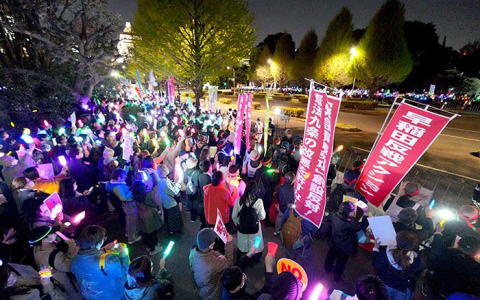 四月八日、「平和憲法を守るための緊急アクション」(主催はWE WANT OUR FUTUREと憲法9条を壊すな! 実行委員会)が開催された。首都・東京では国会議事堂をとり囲むかたちで三万人が結集し、全国四十七都道府県の一三七ヵ所で同時に起ちあがった労働者・学生・市民とともに「戦争反対」「改憲反対」の声をあげた。早稲田大学などの首都圏のたたかう学生たちの力強い声が国会前にこだまし、周辺にいた労働者や市民たちもともに拳を突きあげる。たたかう学生たちは、侵略者どもに外交交渉をお願いするにすぎない日共中央の闘争歪曲をのりこえ、この日の集会を戦闘的に高揚させるために奮闘した。 |