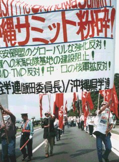 | 沖縄サミット粉砕の大横断幕を先導に 58号線を部瀬名岬にむけて堂々と行進 |