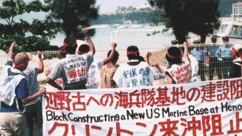 万国津梁館を見すえながら進むデモ隊(許田付近) |